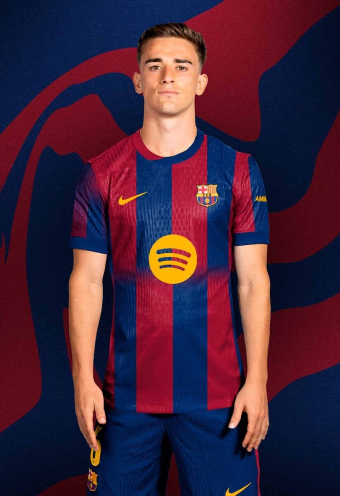 Σχεδιασμένη με βάση την κληρονομιά, ενισχυμένη από τη μουσική και την τεχνολογία. Η εντός έδρας εμφάνιση της Μπαρτσελόνα για τη σεζόν 2025/26 αποτίνει φόρο τιμής στην πλούσια ιστορία του συλλόγου, ενώ ταυτόχρονα αγκαλιάζει το μέλλον μέσω της συνεργασίας με το Spotify. Οι εμβληματικές μπλαουγκράνα ρίγες συνδυάζονται με μοντέρνες λεπτομέρειες και ένα χρυσό λογότυπο χορηγού στο στήθος, υπογραμμίζοντας τη σύνδεση του συλλόγου με τη δημιουργικότητα και τη μουσική κουλτούρα της εποχής.